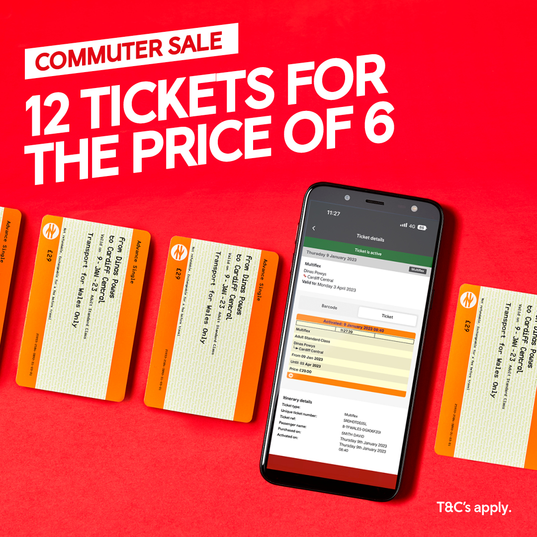 Discounted Multiflex tickets (12 journeys for price of 6) available for sale 9-31 Jan 2023. Tickets are valid for 3 months after purchase. For more information, see tfw.wales/multiflex