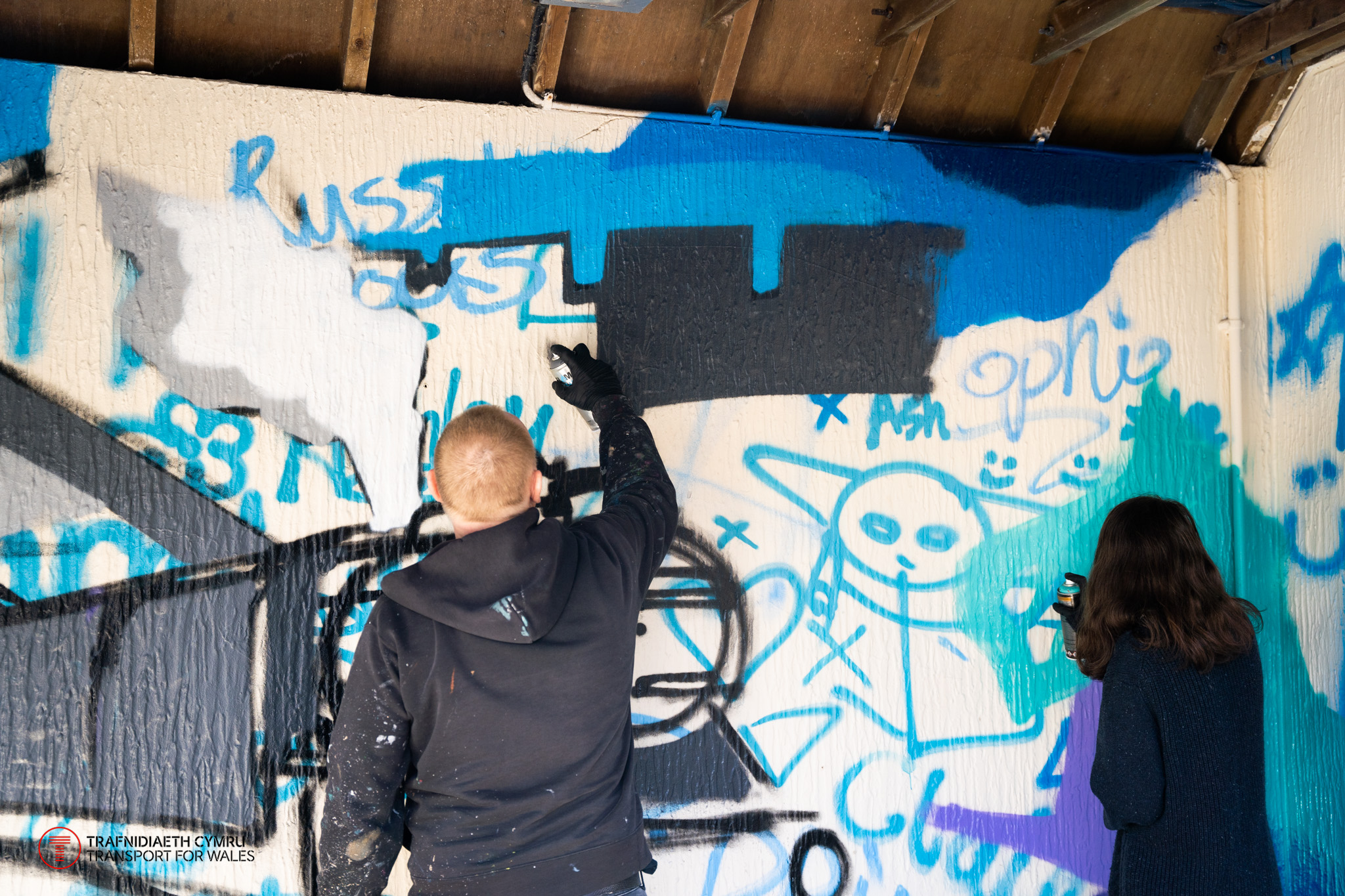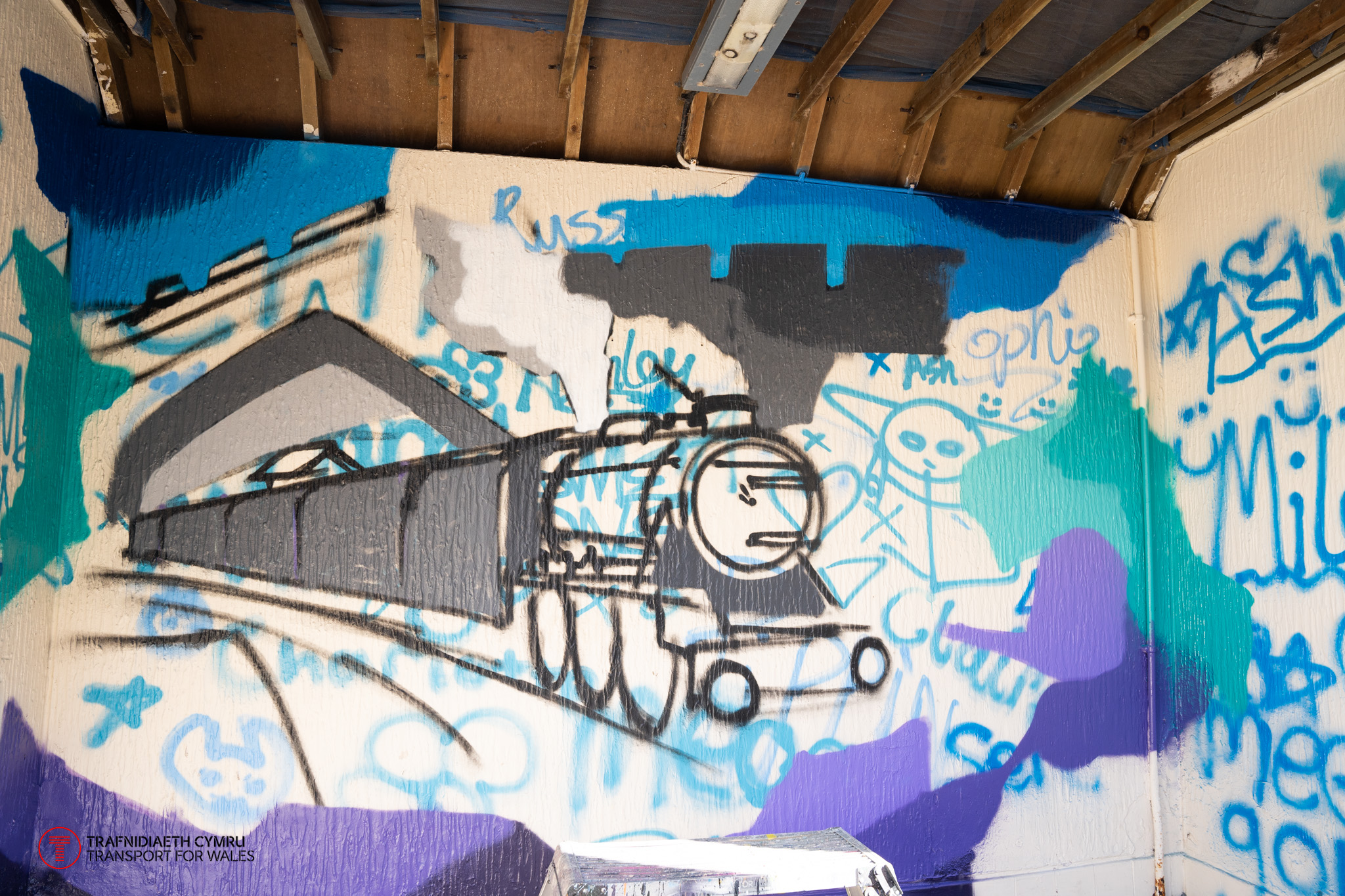 In March, two new art pieces at Conwy station were completed by local graffiti artist Andy Birch in collaboration with students from Ysgol Aberconwy. The pieces cover the inside of two shelters at the station and are inspired by local heritage and culture.