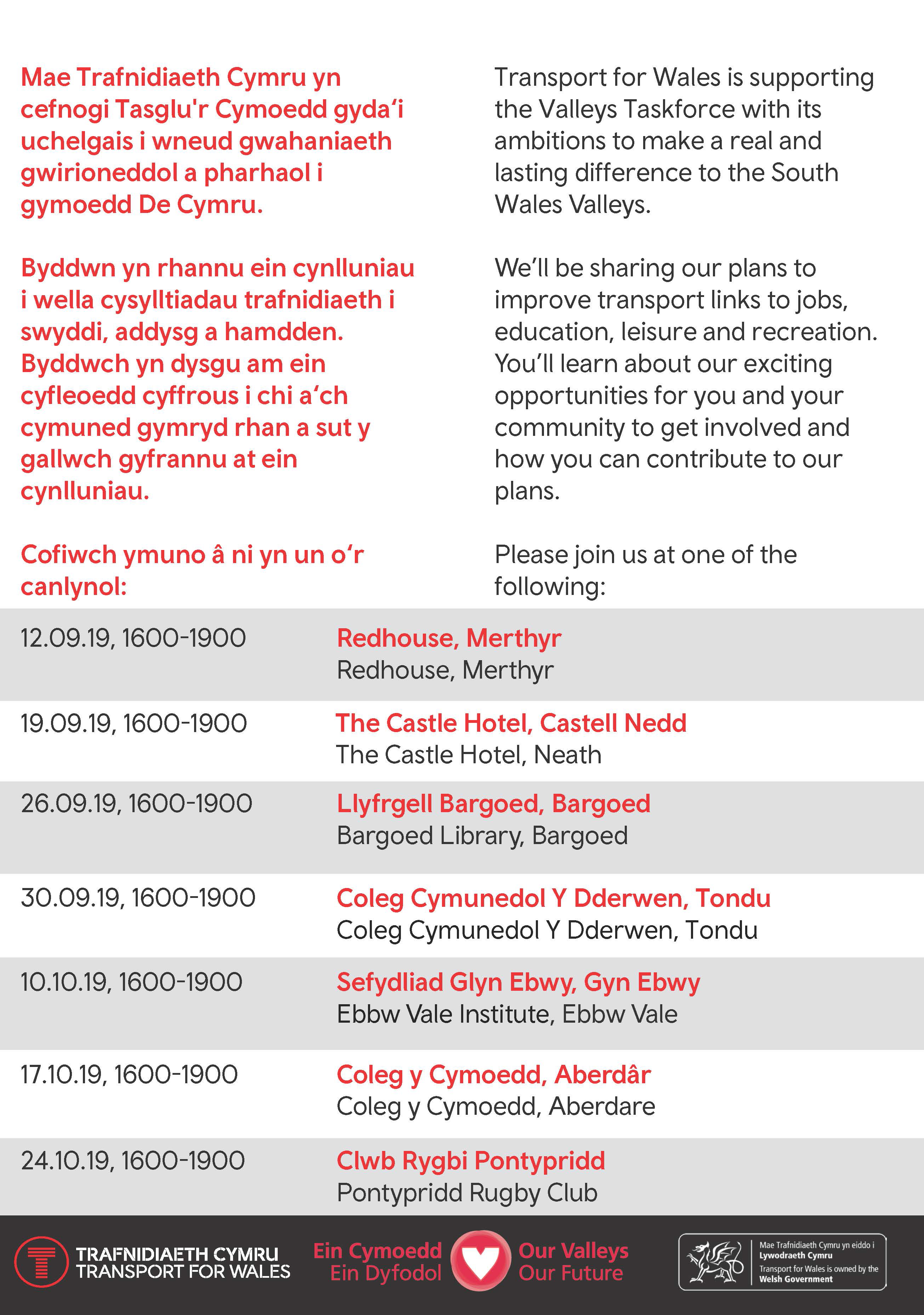 The events are taking place in Merthyr, Neath, Bargoed, Tondu, Ebbw Vale, Aberdare and Pontypridd and will provide local people with an opportunity to meet with representatives from Transport for Wales, local authorities and local Assembly Members to discuss future transport improvements.