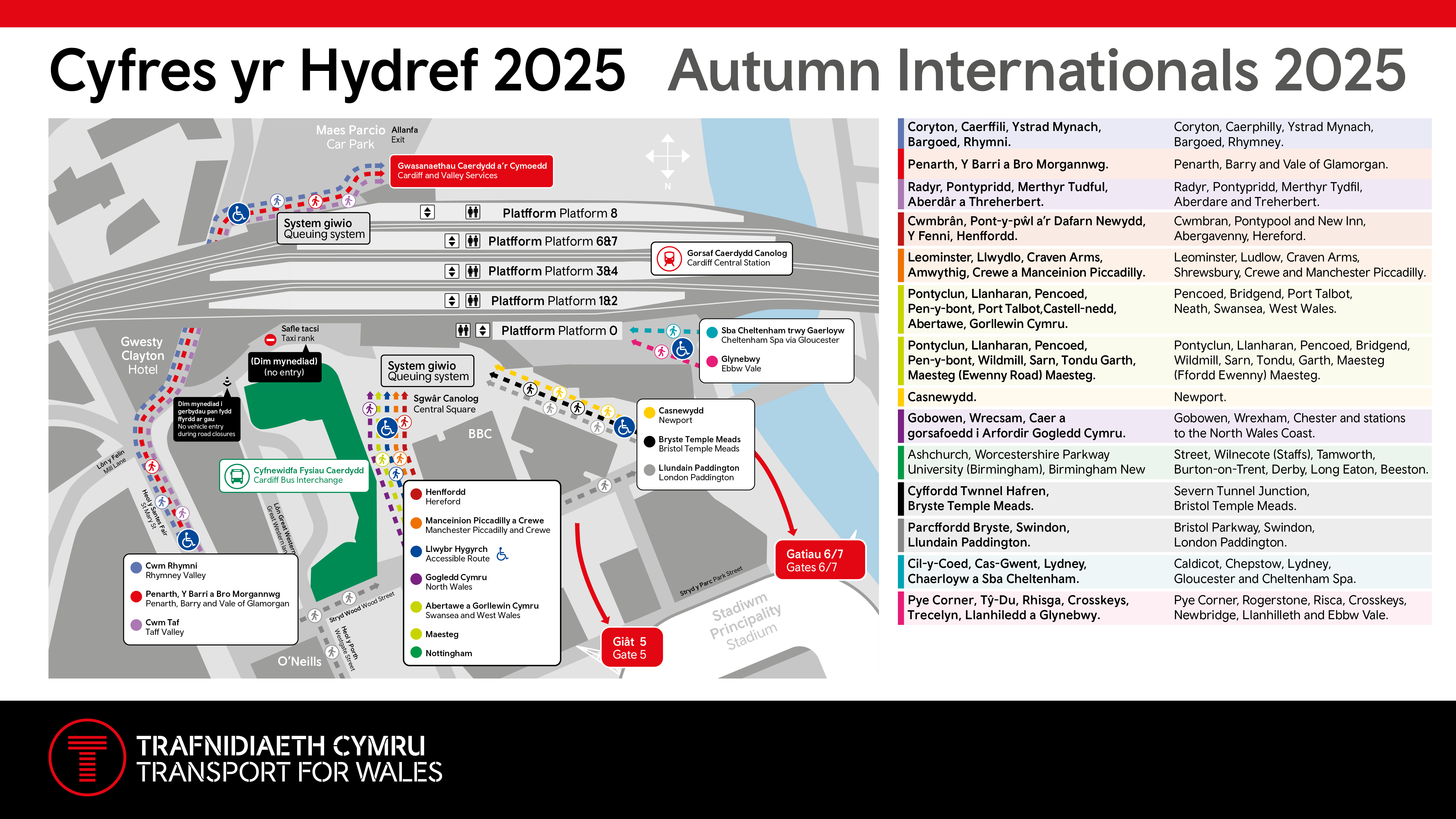 A crowd management queuing system will be in place at Cardiff Central after each match, with queuing for mainline rail services on Central Square and the Valley queues at the rear of the station.