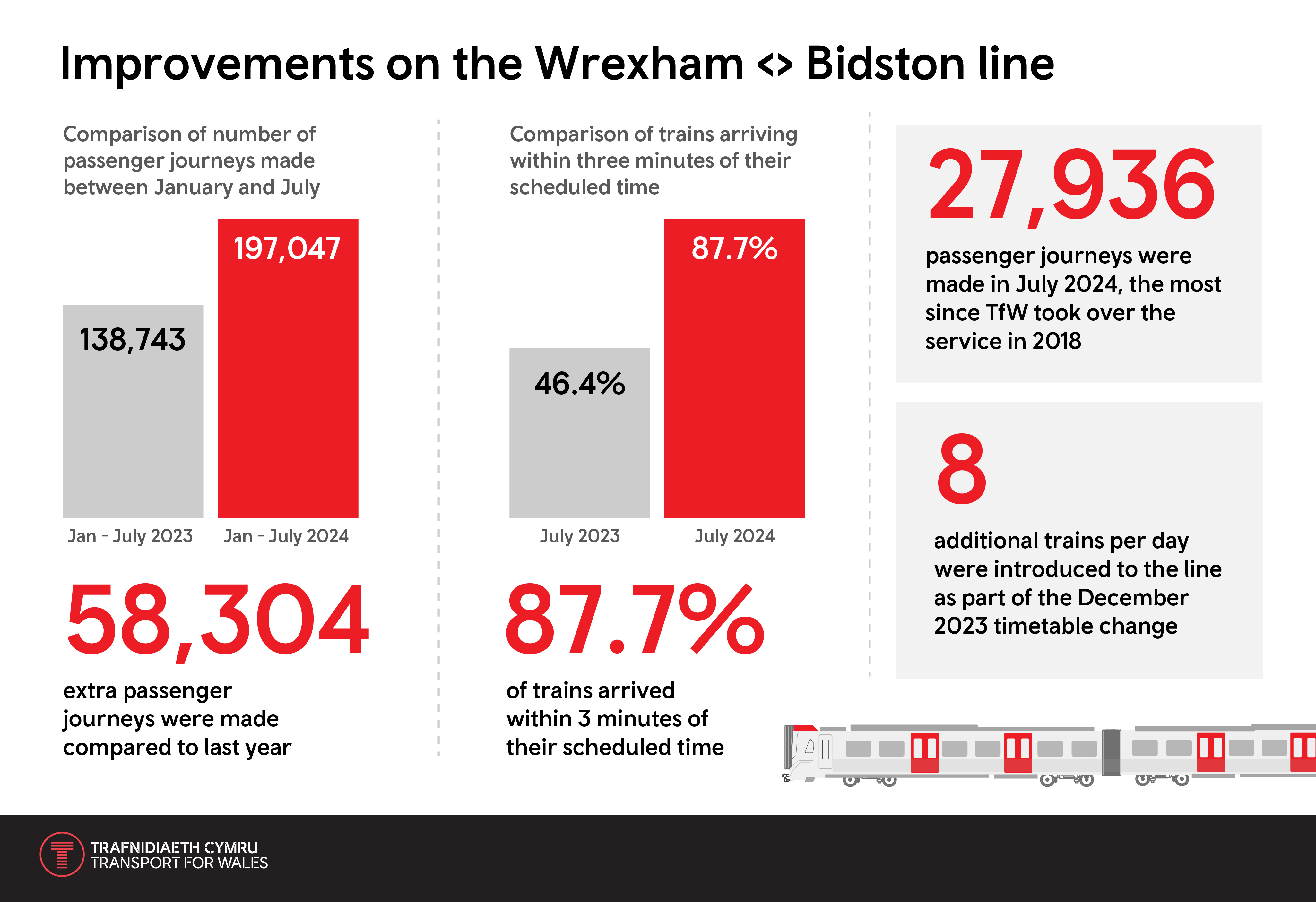 Transport for Wales has revealed new figures for the Wrexham to Bidston rail route showing that between January and July this year, 197,047 journeys were made on the line. For the same period in 2023 the figure was 138,743.